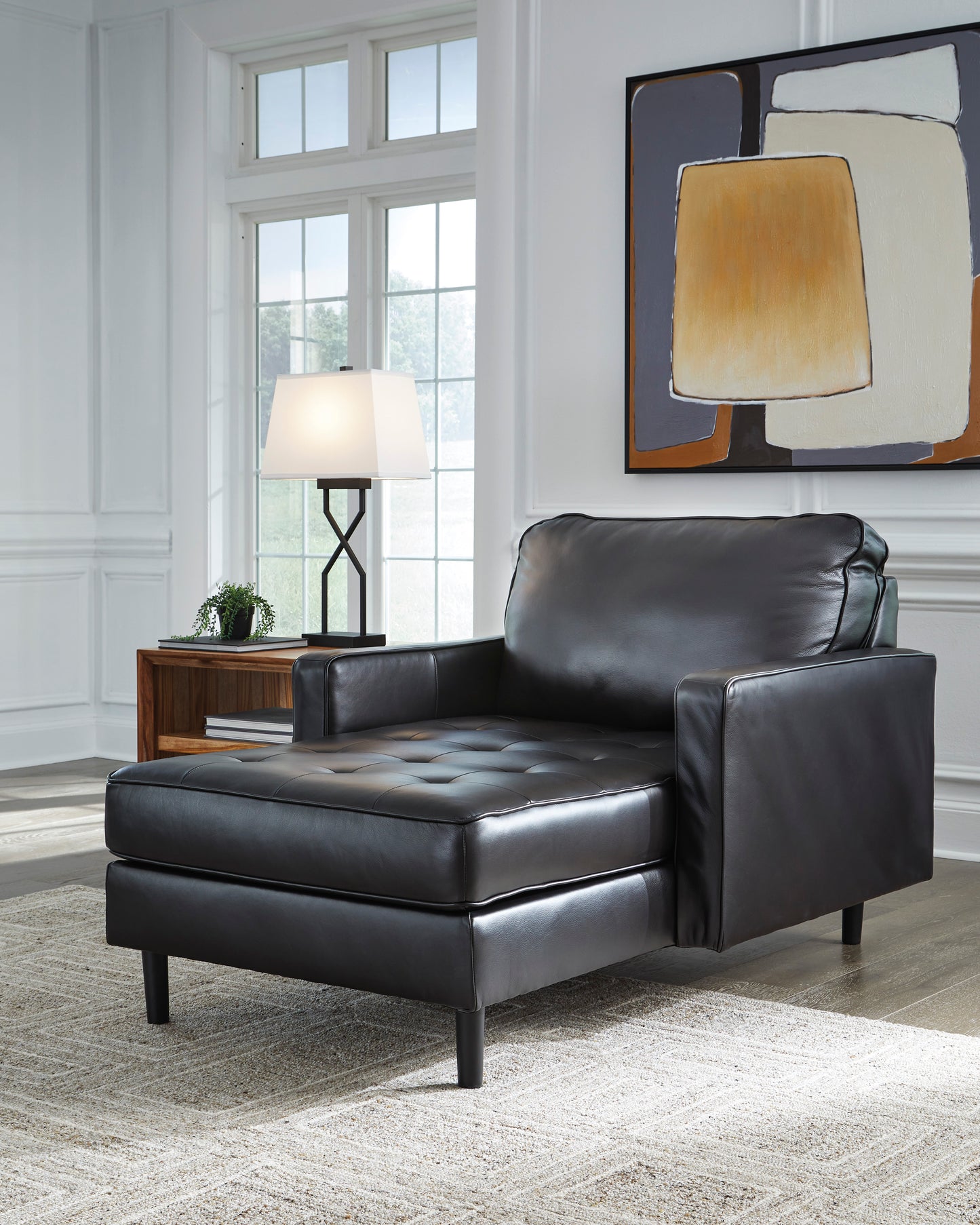 This chaise embodies timeless mid-century elegance with its linear design, sleek track arms and tapered legs. Genuine leather in the seating area adds a luxurious touch to the overall look. Experience endless style opportunities for today's living spaces.