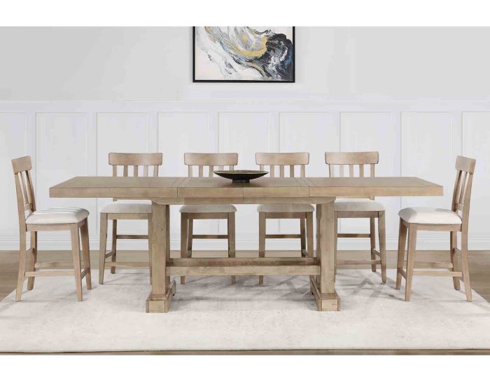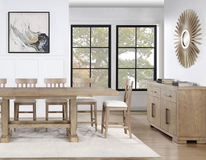 A grandly scaled counter dining collection with modern farmhouse styling, Napa features a Counter Table with ample room for all visitors. The table has a beautiful plank-effect top and comes with two 18-inch leaves that expand it to a full 108-inches for seating of up to ten people. The double pedestal base has exposed and pairs gracefully with the schoolhouse upholstered seat Side Chair for a group that is both stylish and comfortable. Pair with the Napa Server to complete the ultimate in contemporary dining design.