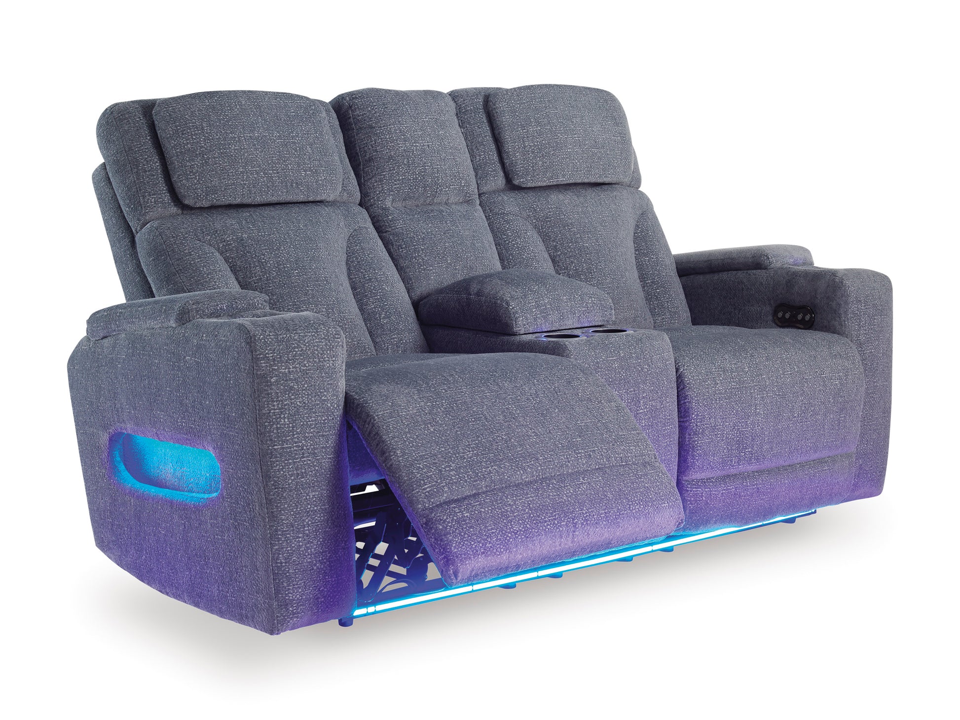 Chill-out time has never looked better. This power reclining loveseat's adjustable headrest ensures a perfect view of the TV no matter how far back you recline, while the extended ottoman takes your comfort to the next level. Handy charging features and storage cutouts put phones and e-readers at your fingertips. Plush yet practical Next-Gen Nuvella™ performance fabric and ambient lighting complete the theater-style experience. It's time to relax, nap or binge-watch in the best seat in the house.